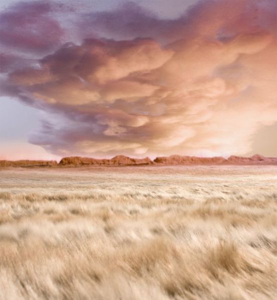 This model is simply made out of faux fur(fields), cotton (clouds) and sifted tile grout(mountains). The perspective is forced as in all of my images, and the lighting effect was created by simply shifting the white balance.